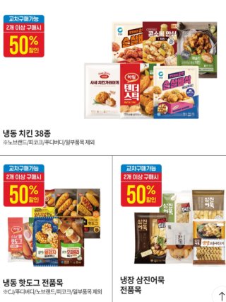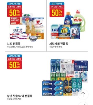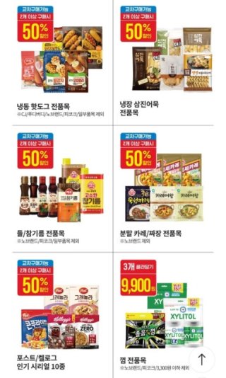 - 최대 혜택: 1+1, 50% 할인, 카드사 추가 할인 등