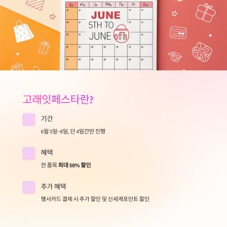 | 가전/잡화 | 선풍기, 써큘레이터, 여름 의류, 캠핑용품 | 최대 30% 할인, 상품권 증정, 카드 무이자 할부 |